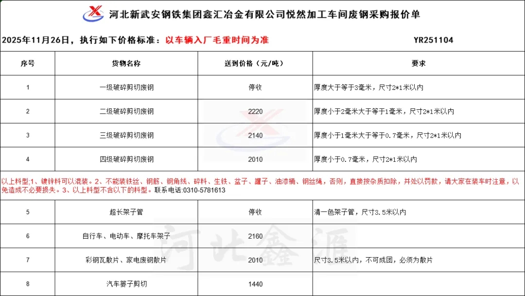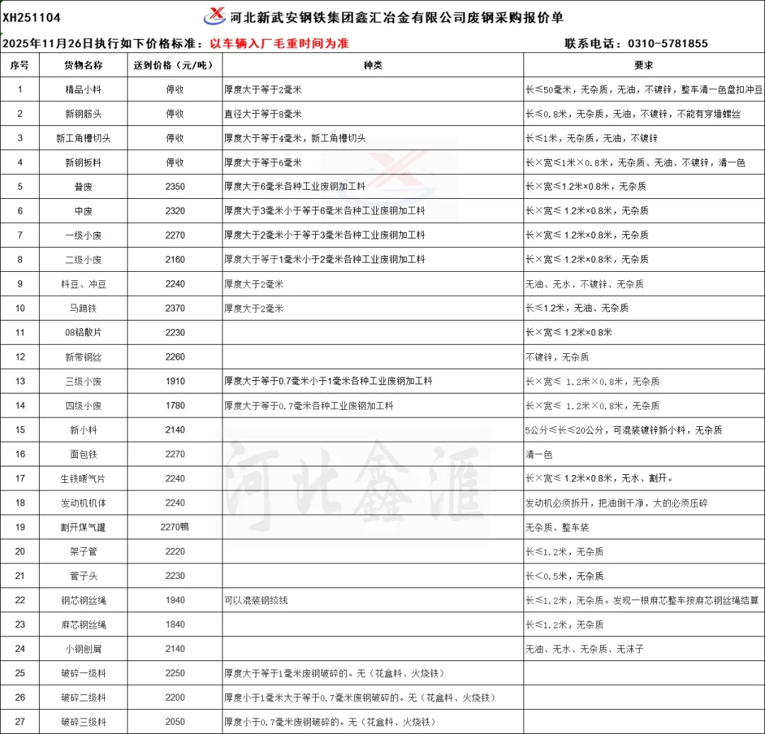 溫馨提示 :廢鋼必須符合種類及要求,不得雜質大、超尺寸、含銅含油、有密封件、含易燃易爆物,不得摻假使假,以次充好,如有上述情況一律拒收。本公司秉承誠信為本、合作多贏、共同發展的經營理念,鼓勵、支持、歡迎所有廢鋼供應商/散戶直接面向我司大量出售廢鋼,手續簡便,結算快捷,24小時收貨、卸車、支付貨款(卸車即支付貨款),童叟無欺、量大量小同樣對待。